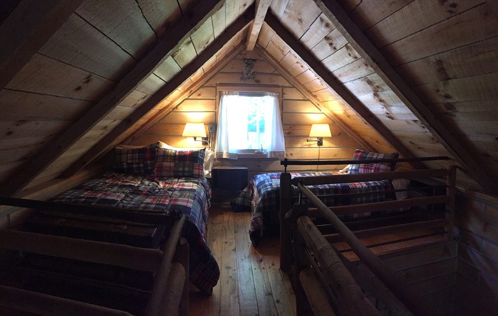 This cabin features one open bedroom at each end of the loft, connected by a catwalk down the center of the cabin. Sleeps 4-5.