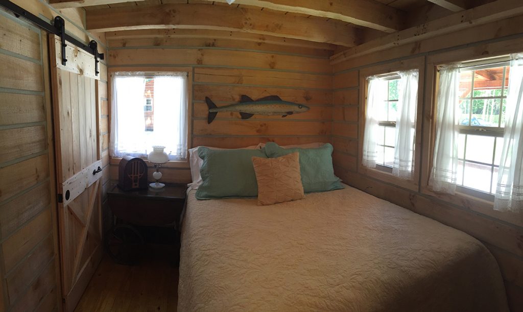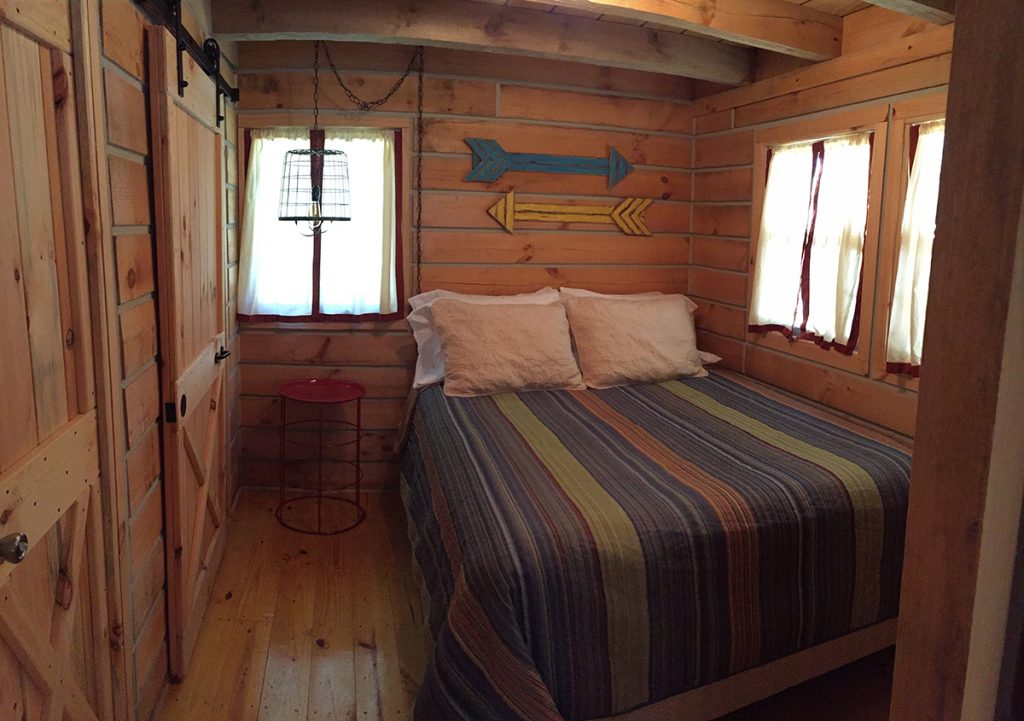 This cabin features one queen bed in a private bedroom. The living area features a couch and a kitchenette. Sleeps 2.