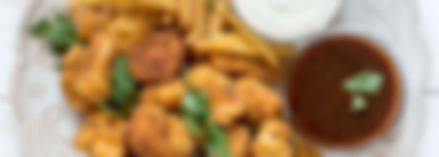 Topped with a garlic seafood sauce & served with garden salad & steak fries or with steamed veggies roast chat potato.